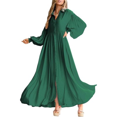 Women's Casual Long Sleeve Button Down Shirt Dress Elegant Pleated Flowy Swing Maxi Dress