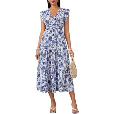 Summer Flowy Bohemian Dresses for Women 2024 Boho Floral V Neck Ruffle Hem Maxi Dress