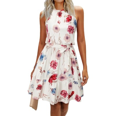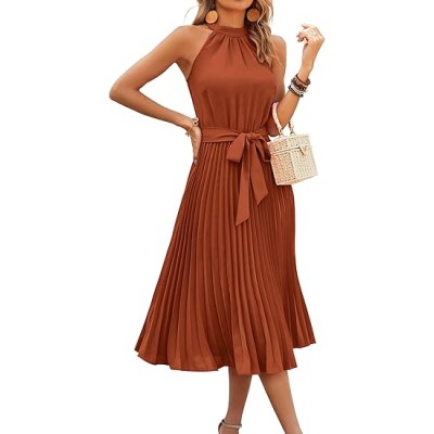 Women's 2025 Summer Sleeveless Halter Neck Pleated Midi Cocktail Dresses A Line Flowy Beach Sun Dress with Belt