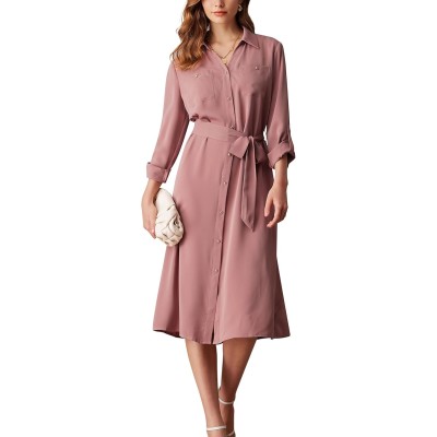 Women's Long Sleeve Button Down Shirt Dress Casual Loose Tie Waist Adjustable Sleeve Length Midi Dresses