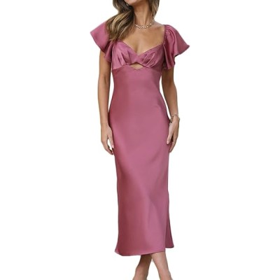 Summer Satin Flutter Sleeve Wedding Guest Dresses for Women Sweetheart Neckline Cutout Tie Back Midi Cocktail Dress