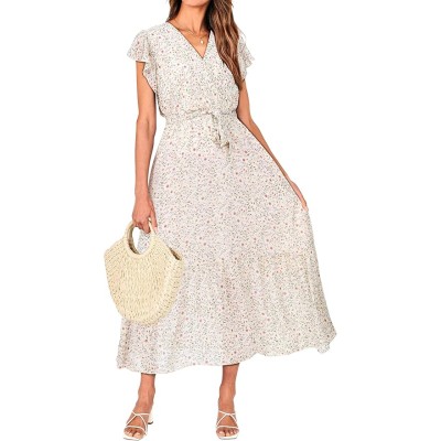 Women Summer Bohemian Floral Casual Wrap V Neck Ruffle Cap Sleeveless Belt A-Line Pleated Hem Midi Sun Dress White
