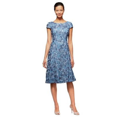 Women's Tea Length Mother of The Bride Dress with Rosette Lace Detail (Petite and Regular Sizes)
