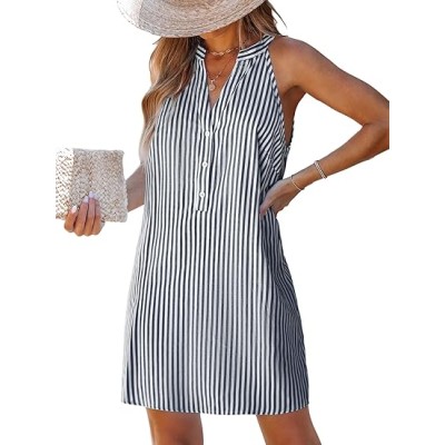Women's Striped Summer Mini Dress A Line Button V Neck Sleeveless Casual Dresses