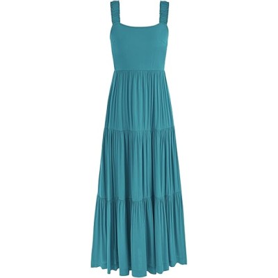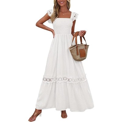 Women's Smocked Summer Maxi Dresses 2025 Ruffle Cap Sleeve Square Neck Lace Detail Flowy Sundress with Pockets