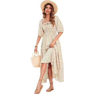 Women's Summer Casual Dresses 2025 Spring Puff Sleeve Square Neck A-line Flowy Boho Floral Smocked Midi Dress