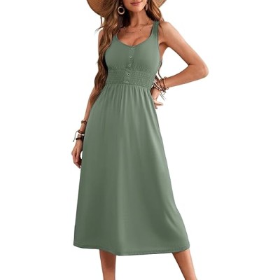 Womens Summer Dresses 2025 Sleeveless Button Down Smocked Empire Waist Casual A-Line Swing Midi Dress Sundress