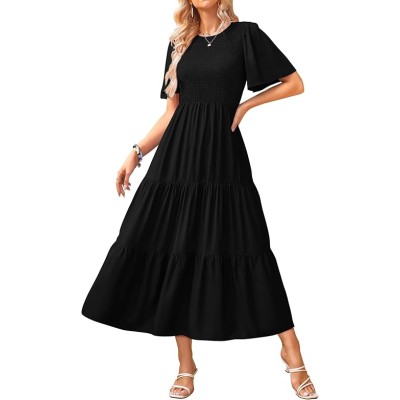 Womens Fashion 2025 Spring Summer Casual Flutter Short Sleeve Midi Dress Smocked Tiered Aline Going Out Dresses