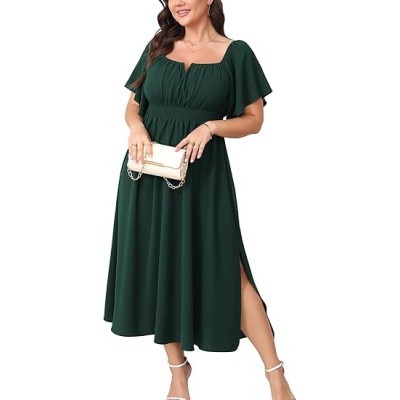Women Plus Size Dress Wedding Guest Formal Ruffle Short Sleeve Square Neck Smocked Flowy A Line Slit Maxi Dresses