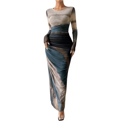 Women's Tie Dye Ruched Long Sleeve Dress Mesh Slim Fit Bodycon Maxi Dresses