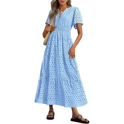 Womens 2025 Summer Maxi Dress Short Sleeve V Neck Hollow Out Eyelet A Line Long Flowy Beach Vacation Dresses
