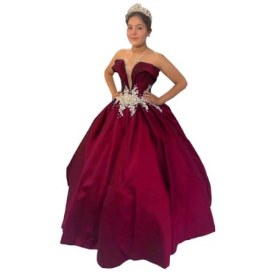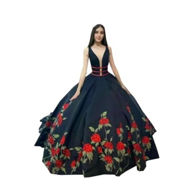 Red Flower Embroidered A line Wedding Dresses for Bride Deep V Neck Satin Prom Quince Dress 2025