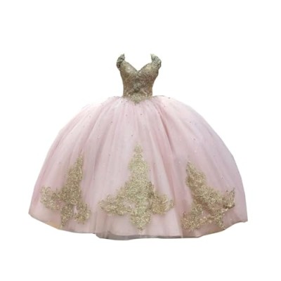 V Neck Ball Gown Gold Embroideried 2025 Prom Evening Formal Dresses with Cap Sleeves Corset Back