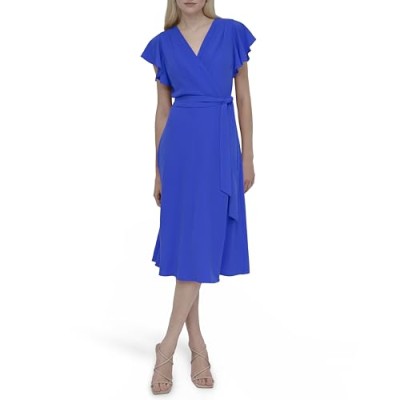 Women's Flutter Sleeve Tie Fit and Flare Midi Dress