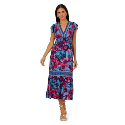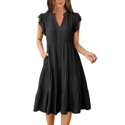 Womens Summer Dress Ruffle Sleeve V Neck Midi Dresses Fashion Casual Fit Flowy Tiered Boho Beach Vacation Sundress